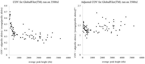 Coefficient of variation (COV) plotted against average peak height for 85 GlobalFiler™ DNA profiles produced on a 3500xl capillary electrophoresis instrument. The left shows the relationship when standard COV is calculated, and the right shows the trend when average peak heights are adjusted by raising to the power of 0.8 prior to calculation of COV. Following the power function, there is no correlation between peak height and COV.