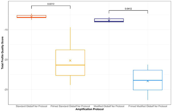 Boxplots demonstrating the spread in profile quality scores across the STR profiles produced using 30 pg of control DNA, following the standard 30-cycle GlobalFiler protocol (orange), the standard 30-cycle GlobalFiler protocol primed with 16-qPCR cycles (yellow), the modified 30-cycle GlobalFiler protocol (dark blue), and the modified 30-cycle GlobalFiler protocol primed with 16-qPCR cycles (light blue). For all PCRs, the combined GlobalFilerTM and Investigator Quantiplex Pro Combination Kit was used for amplification. Significant p-values obtained from post hoc Games–Howell tests comparing the profile quality scores between the various PCR protocols used are shown. The means are indicated by an X, and for all protocols n = 5.