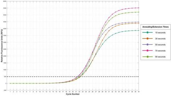 However, when relative fluorescence was plotted against cycle number instead of total runtime, all programs trialled crossed the detection threshold of 500 RFU between 22 and 23 cycles and reached maximum fluorescence at approximately the 37-cycle mark (Figure 5), thus indicating that, despite the difference in total runtimes, each of the qPCR programs trialled produce very similar threshold values (Ct). This suggests that the effect of altering the timing of this step after the first 16 cycles is minimal when detecting the Ct value and on the overall amplification efficiency. However, the substantial differences in maximum fluorescence observed between the qPCR programs trialled indicates that increasing the annealing/extension time does increase the amount of PCR target that is amplified, with an annealing/extension time of 70 s producing the greatest amount of PCR product (Figure 5). Increasing the time for annealing and extension to occur to 90 s was found to be detrimental to both the amount of DNA amplified (RFU) and the rate at which it was amplified (amplification efficiency).