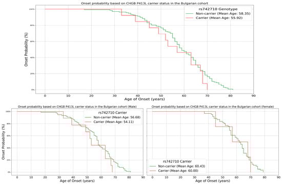 Genotype and allele frequencies for rs742710 were compared between the patient cohort and data available from the Genome Aggregation Database (GnomAD, available at https://gnomad.broadinstitute.org/, accessed on 15 June 2024) v2.1.1 for 339 Bulgarian controls, 226 non-neuro controls, 24,133 non-Finnish European (NFE) controls, and 51,547 NFE non-neuro individuals [42]. The ALS patient group was compared against these control groups to identify any significant differences in genotype and allele distributions. The age of onset followed a normal distribution with a right skew, with 54% of the patients falling into the typical 55- to 70-year onset and the remaining 46% outside of this age range. One-way ANOVA was performed using genotype status or minor allele carrier status and age of onset using IBM SPSS Statistics for Windows version 25.0 (released 2017; IBM Corp., Armonk, New York, NY, USA) analysis software. Kaplan–Meier plots were generated using the lifelines library for the Python programming language by grouping the patients based on their genotype or allele carrier status for the whole cohort as well as split by sex and plotting the age of onset across the groups.