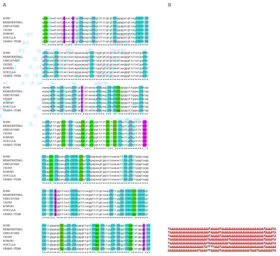 An alignment of the chosen 24 CpG-rich, lined-up 5′-regulatory regions of conserved housekeeping genes from all seven species reveals the grade of conservation (an excerpt of this alignment of 420 nt is presented in Figure 1A). The sequences aligned were of a total length of 27,061 nucleotides from H. sapiens, 27,061 from H. neanderthalensis, 27,060 from Denisovan human, 27,037 from P. troglodytes, 27,072 from P. paniscus, 27,040 from G. gorilla, and 27,037 from P. pygmaeus. The sequence homologies are for example 99.9% between H. sapiens, H. neanderthalensis, and Denisovan human. The differences between these species and P. troglodytes, P. paniscus, G. gorilla, and P. pygmaeus are 99%, 99%, 98.6%, and 97.3%, respectively. All sequence homologies between these seven sequences are listed in detail in %, in Table 1. The largest difference appears between the hominins and P. pygmaeus with 97.18%.