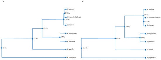 Finally, the UPGMA phylogenetic trees, one based on all single-nucleotide changes including CpG sites, small deletions, and nucleotides gains (Figure 2A) and one based solely on consistent CpG dinucleotides and CpG alterations, as explained (Figure 2B), preferably referred to here as a phylo-epigenetic tree, are presented (Figure 2). The first one displays a closer relation of H. sapiens to H. neanderthalensis than to Denisovan humans. All the other branchpoints and branches indicate divergence events and species relations, respectively, as they are established in the literature. The tree of Figure 2B resembles the phylogenetic tree of Figure 2A, with the difference that H. neanderthalensis appears nearer to Denisovan humans than to H. sapiens. When both trees are calibrated by the divergence time point of the common chimpanzee (P. troglodytes) and the bonobo or pygmy chimpanzee (P. paniscus), that is, 1.7 My [20], the phylo-epigenetic tree displays evolutionary distances between the species as has been suggested [21,22]. Thus, the resulting phylo-epigenetic tree based solely on all CpG dinucleotides and CpG dinucleotide differences reveals an image of these interspecies relations that precisely fit the current established knowledge in this field with decades of research.