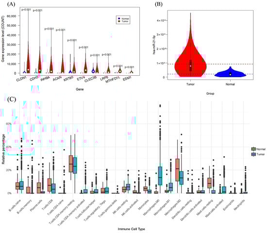 Significantly different characteristics between cancer and normal samples: (A) top 10 most significant mRNAs; (B) most significant differential miRNAs; (C) differential boxplots of 22 immune cells.
