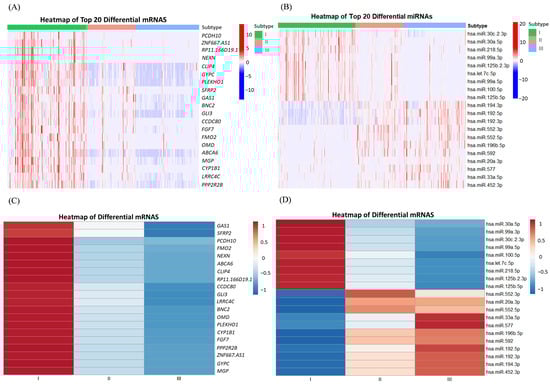 Heat maps of the top 20 significantly differentially expressed genes (DEGs): (A) mRNA expression heat map; (B) miRNA expression heat map; (C) mRNA expression heat map after taking the mean for the corresponding feature of the same subtype sample; (D) miRNA expression heat map after taking the mean for the corresponding feature of the same subtype sample.