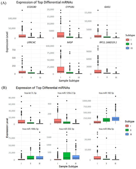 Six features with the most significant differences among the three subtypes: (A) Top six most significantly differentially expressed mRNAs; (B) Top six most significantly differentially expressed miRNAs.