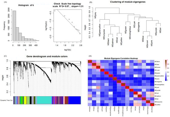 Results of Weighted Gene Co-expression Network Analysis (WGCNA): (A) Scale-Free Topology Analysis, frequency distribution of the number of connections (i.e., node degree, k) in the network (left), and a test of the scale-independent nature of the network (right); (B) Clustering of Module Eigengenes; (C) Gene Dendrogram and Module Colors, different colors represent different modules; (D) Module Eigengene Correlation Heatmap.