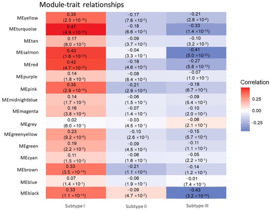 Weighted Gene Co-expression Network Analysis (WGCNA) was conducted on mRNA data based on the samples from three subtypes, encompassing a total of 515 samples and 5844 genes. Initially, during the analysis, 5000 genes with the highest variability were selected. Using the histogram algorithm, the soft-thresholding power β = 3 was identified, thereby achieving an R2 value of 0.88 and an average connectivity below 100 to meet our criteria (Figure S3). It can be observed in Figure 5A that (1) most mRNAs exhibit low connectivity, (2) only a minority demonstrates high connectivity, and (3) the constructed network exhibits scale-free properties. The dissTOM matrix was constructed by leveraging the topological overlap matrix (TOM) similarities to quantify gene-expression dissimilarities. This matrix forms the foundation for clustering and subsequent module identification, and the “cutreeDynamic” algorithm from the WGCNA package (version 1.72.5; R package from CRAN) was employed for dynamic pruning to discern 16 modules encompassing all genes. Module sizes ranged from a minimum of 33 genes to a maximum of 1747 genes with only 25 genes included in the gray module. The gray module was excluded from subsequent analyses, and the number of genes in each module is detailed in Table S3.