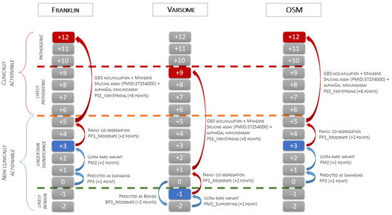 - VUS, when using OSM, which activates the PM2 criterion with moderate strength, and the PP3 criterion (MaxEntScan splice effect variation of −75.82% and SpliceAI Donor Loss of 0.81; High impact).