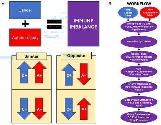 Rationale and Workflow Visualization for the Immune Imbalance Transcriptomics (IIT) algorithm. (A) Using cancer, autoimmune, and healthy control data from the same tissue type, IIT seeks to identify differentially expressed genes from four quadrant profiles, which can be described in two distinct groupings: (1) two profiles that both indicate similar gene expression, including genes upregulated in both cancer and autoimmunity (C+A+) and genes downregulated in both cancer and autoimmunity (C−A−); and (2) two profiles that show opposite gene expression, that is, genes upregulated in cancer but downregulated in autoimmunity (C+A−) and genes downregulated in cancer but upregulated in autoimmunity (C−A+). The results and discussion refer to these four immune imbalance quadrant profiles. (B) A visual representation of the IIT algorithm workflow (see Section 2, Materials and Methods for additional detail).