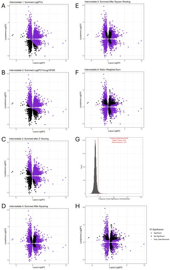 Lupus–Lymphoma IIT Calculation Increases Statistical Stringency through Multiple Filtering Steps. (A) Summation of unaltered log2FCs ignores some gene results from three of four quadrants. (B) Weighting log2FCs by −log10FDR (mlog10FDR) acknowledges statistical nuance; * represents multiplication in this panel heading. (C) Z-scoring log2FC distributions diminishes the bias toward more extreme cancer log2FCs in final summation results. (D) Squaring all log2FC values before summation allows gathering of results from all four quadrants. (E) Square rooting all values diminishes outlier values. (F) Ratio weighting of each summed value includes more results with extreme lupus expression. (G) Histogram visualization of gene frequency counts from the IIT-significant portion of the null distribution. The frequency gate threshold, as determined by the p-value test, is marked in red on the histogram. (H) The differentially expressed genes (DEGs) that were significant in both the lupus vs. healthy and the lymphoma vs. healthy results. The lupus log2FCs are along the x-axis, while lymphoma log2FCs are on the y-axis, with each dot representing one gene. Genes with significant IIT scores are plotted in purple. Genes not significant based on the null distribution are plotted in black. Genes that were removed by the noise-detecting frequency gate are plotted in gray. Quadrants in the graph are divided by the axes.