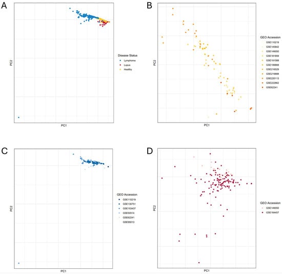After identifying the FASTQ files for the relevant human samples, the sequencing reads were trimmed, mapped, and quantified against the human reference transcriptome. Transcript-level read counts were aggregated to calculate the gene read counts. We applied a z-score normalization to the gene read count table (by gene) to avoid amplifying the impact of genes with high read counts and then ran a principal component analysis (PCA) to observe the relationship between samples and evaluate their similarity (Figure 3, Supplementary Figure S2). We found that the samples from different disease statuses (healthy, lupus, or lymphoma patients) generally clustered together (with the exception of one lymphoma sample), and with some overlap between the phenotypic groups (Figure 3A), which is expected given that the samples were obtained from the same cell type with differing phenotypes. Metadata, such as sex, age, ethnicity, and disease diagnosis/stage are incredibly useful but are unfortunately somewhat inconsistent in publicly available datasets. Though we reviewed the literature and sample metadata to collect all the published sample metrics and attributes, many samples were not published with metadata beyond cell type and overall disease category. We visualized sex, age, ethnicity, and reported disease diagnosis/stage (Supplementary Figure S2). Our finding was that samples did not appear to be grouped by age, ethnicity, or sex. Additional studies with metadata are needed to fully evaluate this preliminary finding due to the large quantity of missing metadata in the current dataset. We did note when visualizing the reported lymphoma diagnosis/stage that the diffuse large B-cell lymphoma (DLBCL) samples tended to cluster together, with follicular lymphoma (FL) samples clustering slightly to the side (Supplementary Figure S2). We next colored the samples by study of origin and observed that the samples from each disease/control group were interspersed from the multiple sequencing projects, suggesting a degree of similarity among samples from the same phenotypic groups, with relatively few batch effects among studies or phenotypes (Figure 3B–D, Supplementary Figure S2). These files were then assessed for differential gene expression using the Automated Reproducible Modular workflow for preprocessing and differential analysis of RNA-seq data (ARMOR) [,], making two comparisons as follows: lupus vs. healthy and lymphoma vs. healthy. We found ~10,000 genes that displayed significant differential expression in the lupus vs. healthy analysis (Supplementary File S5) and ~16,000 significant genes in the lymphoma vs. healthy analysis (Supplementary File S6).
