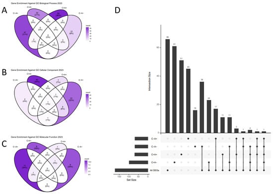 Lupus–Lymphoma IIT Gene Quadrants and GO Enrichment. (A) Gene Ontology (GO) term enrichment, by quadrant, against the Biological Process GO library. (B) Gene Ontology (GO) term enrichment, by quadrant, against the Cellular Component GO library. (C) Gene Ontology (GO) term enrichment, by quadrant, against the Molecular Function GO library. (D) Upset chart (an alternative to a five-way Venn diagram) showing the overlapping GO Results from all included GO libraries between individual quadrant enrichment lists and the enrichment list of the entire significant gene dataset.