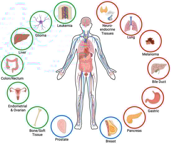 The tissue-specific roles of menin in cancer. In the nearly three decades since menin was first discovered and identified as a potent suppressor of neuroendocrine tumorigenesis, the field of menin in cancer has expanded greatly. Menin is now understood to play a role in the development of a broad range of solid and hematologic cancers. Notably, the role played by menin in tumorigenesis varies depending on the tumor type and, in some tumors, the specific context. While menin has been recognized as a suppressor of neuroendocrine tumor growth for decades, menin is increasingly appreciated for its function as a tumor suppressor (red circle) in the bile ducts, exocrine pancreas, stomach, lungs, and melanocytes of the skin. On the other hand, menin is also increasingly recognized to function as a tumor promoter (green circle) in the blood, colon, ovaries, endometrium, bone/soft tissue, and glial cells of the central nervous system. Menin can also either suppress or promote breast and prostate tumorigenesis depending on hormone receptor status and may have dual functions in the liver (blue circle). Though it remains unclear precisely how menin suppresses some types of solid tumors while promoting the development of others, the striking increase in the amount of menin-focused cancer research over the past decade promises advancements that will continue to expand our understanding of menin biology. The next decade of menin research in cancer is sure to be enlightening. Created with BioRender.com.