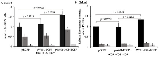 To assess the impact of nucleosome positioning sequences on the efficiency of the expression and retention of reporter eGFP from plasmids transfected as “naked DNA”, the parent plasmid (peGFP), the plasmid containing Widom601 array (pW601-eGFP), or the plasmid containing the Widom601 array plus a 100 bp insert (pW601-100b-eGFP) (Figure 1B) were transfected into human 143B cells and assessed for the efficiency of expression of eGFP at ~72 h (D3), 144 h (D6), and 216 h (D9) post-transfection by flow cytometry. The expression of eGFP was assessed by two parameters: the percentage of cells in the population that expressed eGFP, as well as the intensity of the fluorescence of the eGFP+ subpopulation (Figure 2). eGFP was expressed in 15.8 ± 4.6%, n = 6, of the cells transfected with peGFP at three days post-transfection. This eGFP+ subpopulation had a mean fluorescence intensity of 890,541 ± 68,348, n = 6. Introduction of the Widom601 array upstream of the EF1α promoter (pW601-eGFP) did not significantly impact the percentage of cells transiently expressing eGFP relative to those cells transfected with the parent plasmid peGFP (Figure 2A). In contrast, transfection with pW601-100b-eGFP resulted in a significantly greater percentage of eGFP+ cells relative to that observed for either peGFP or pW601-eGFP at three days post-transfection, p = 0.0004 and p = 0.0036, n = 6, respectively. Similarly, the eGFP+ subpopulation in cells transfected with pW601-100b-eGFP exhibited a higher mean fluorescence intensity relative to that observed in cells transfected with peGFP or pW601-eGFP at three days post-transfection, p = 0.0245 and p = 0.0165, n = 6, respectively (Figure 2B). Together, these observations indicated that sequences capable of influencing nucleosome positioning could alter the percentage of cells initially expressing eGFP as well as the level of eGFP expressed in those cells.