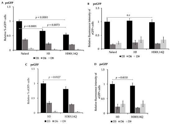 Impacts of pre-assembling peGFP into chromatin on expression of eGFP. 143B cells transfected with peGFP (unassembled), or peGFP pre-assembled with unmodified recombinant histone octamers (H3) or with histone octamers containing H3K9,14Q were analyzed for expression of eGFP by flow cytometry at ~72 h (D3), ~144 h (D6), and ~216 h (D9) post-transfection. (A) Percent of eGFP+ cells at D3, D6, and D9 were calculated for samples transfected with the indicated constructs, and then normalized relative to percent of eGFP+ cells at D3 from cells transfected with (naked) peGFP, which was set to 1 as in Figure 2 (mean ± STD, n = 4); (B) mean fluorescence intensities of eGFP+ subpopulations in (A) were calculated and then normalized relative to the mean fluorescence intensity at D3 of cells transfected with (naked) peGFP, which was set to 1 (see Figure 2, mean ± STD, n = 4); (C,D) impact of H3 vs. H3K9,14Q-containing chromatin on expression of eGFP. (C) Percentages of eGFP+ cells at D3, D6, and D9 from cells transfected with the peGFP pre-assembled with histone octamers containing H3 (H3) or H3K9,14Q (H3K9,14Q) were calculated and then normalized relative to percent of eGFP+ cells at D3 from cells transfected with peGFP pre-assembled with unmodified histones (H3), which was set to 1 (mean ± STD, n = 4). (D) Mean fluorescence intensity of eGFP+ subpopulation in (C) was normalized relative to mean fluorescence intensity of eGFP+ subpopulation at D3 from cells transfected with peGFP pre-assembled with unmodified histone octamers (H3), which was set to 1 (mean ± STD, n = 4). Statistical significance and p values were determined as in Figure 2.
