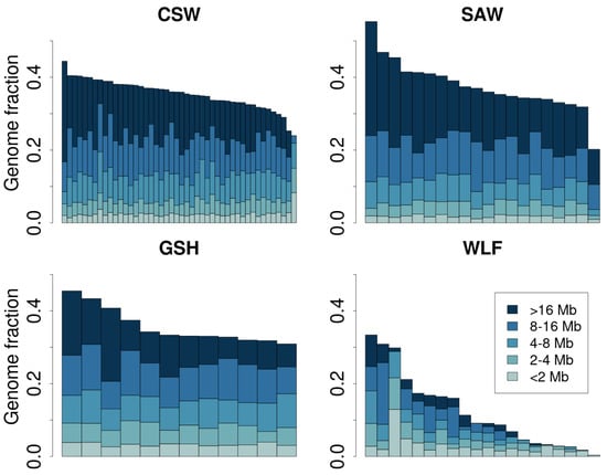 Genome-wide distribution of ROH length classes for each individual of the studied breeds: Czechoslovakian Wolfdogs (CSWs), Saarloos Wolfdogs (SAWs), German Shepherds (GSHs), and wolves (WLFs).