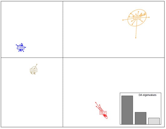 Discriminant Analysis of Principal Components (DAPC) showing the relationships among the 4 studied groups—Saarloos Wolfdogs (SAWs), Czechoslovakian Wolfdogs (CSWs), German Shepherds (GSHs), and wolves (WLFs).