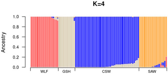 The hybrid breeds (CSW and SAW) are clearly distinguished from both parental populations (GSH and WLF; Figure 2) and formed clearly bounded groups. Linear Discriminant 1 positions both wolfdog breeds on opposite sides of the axis, while Linear Discriminant 2 suggests their certain proximity. The genetic variability within SAWs is considerably higher than in CSWs. The final number of incorporated axes is 7 (Figure S1). ADMIXTURE analysis revealed the lowest CV (0.4874) at K = 4, clearly recognizing all four studied groups—SAW, CSW, GSH, and WLF—with very limited deviations (Figure 3). Mean estimated membership (Q value, Table 5) to the population was 0.99 (±0.02) for WLFs, 0.96 (±0.04) for SAWs, 0.99 (±0.01) for GSHs, and 0.97 (±0.04) for CSWs.