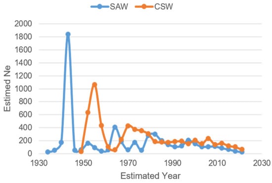 The demographic trajectories estimated from LD well reflects the history of the two breeds, which experienced continuous population declines beginning about 20–25 generations ago, ranging from a maximum of 1840 individuals in 1943 to a minimum of 24 individuals in 2021 for the SAW, and from a maximum of 1076 individuals in 1955 to a minimum of 65 individuals in 2021 for the CSW. In particular, the estimated demographic trajectories showed a first NE peak in SAWs at the beginning of the 1940s and in the CSW in the mid 1950s (Figure 4), likely corresponding to the first wolf × dog crossings during the origin of the breeds, followed by a progressive decline interspersed with minor peaks possibly corresponding to subsequent wolf or dog additions [16]. Overall, the estimated NE was higher for the CSW than for the SAW.