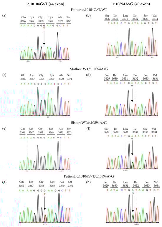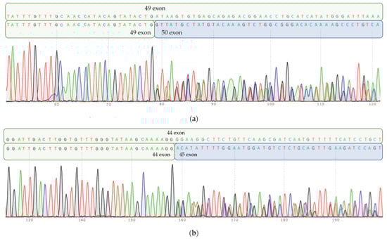 Parents’ cDNA Sanger sequencing. (a) Mother’s cDNA Sanger sequencing: heterozygous c.10894A>G substitution in 49 exon leads to inappropriate splicing of RNA and “loss” of 47 b.p. Normal allele sequence (part of 49 exon) is depicted on a top row, and mutant allele (truncated 49 exon, followed by 50 exon) is depicted on the bottom row. (b) Fathers’ cDNA Sanger sequencing: heterozygous c.10104G>T substitution in 44 exon results in aberrant RNA splicing and “loss” of 41 b.p. Normal allele sequence (part of 44 exon) is depicted on a top row, mutant allele (truncated 44 exon, followed by 45 exon) is depicted on the bottom row.