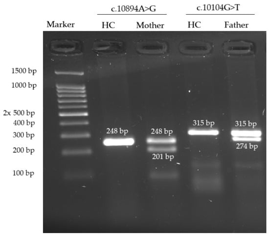 Agarose gel cDNA electrophoresis revealed the presence of an abnormally shortened cDNA fragment in each variant’s case. HC—healthy control. Ethidium bromide staining.