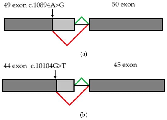 Schematic diagram illustrating abnormal splicing signature: (a) due to c.10894A>G substitution (b) due to c.10104G>T substitution. Constitutive splicing is depicted by green lines; altered splicing is depicted by red lines.