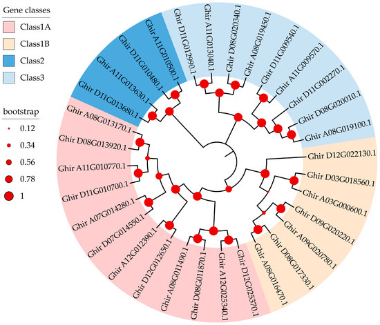 Phylogenetic tree of MYC proteins in upland cotton. The phylogenetic tree was constructed using the MEGA X with 1000 bootstrap replicates. Based on the phylogenetic tree, the MYC gene family was divided into three classes, which are shown in different colors. Among them, class 1 was divided into two subgroups. The bootstrap value is shown as a red ring.