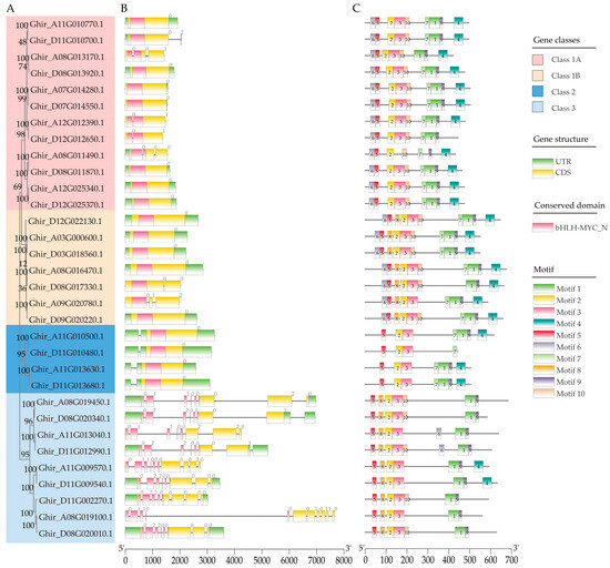 A detailed examination of the gene structure and architecture features of the conserved protein motifs in GhMYC genes. (A) The phylogenetic tree was constructed using the full-length sequences of the GhMYC proteins. (B) The exon–intron structure of GhMYCs is presented herewith. The untranslated regions, exons, and introns are represented by light green boxes, light yellow boxes, and horizontal lines, respectively. The red boxes represent the bHLH-MYC_N domain. (C) Ten types of conserved motifs, indicated by different colored boxes, were predicted in the GhMYCs protein sequences. The primary distinction between class 1A and class 1B is the absence or presence of motif 8.