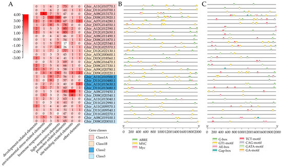 In the 2000 bp promoter regions of the GhMYCs, cis-acting elements were predicted. (A) A schematic representation of the number of cis-acting elements detected in the promoter region of each GhMYC gene. All cis-acting elements were classified into seven distinct categories, with the number of elements within each category normalized by column. (B,C) The distribution of hormone-responsive (B) and light-responsive (C) elements in the promoter region of the GhMYC gene is examined.