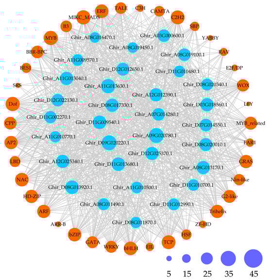 Regulatory network between GhMYCs and potential transcription factors (TFs) was demonstrated. Blue rings with gene ID represent GhMYCs, orange rings with TF name represent possible TFs, and gray lines represent potential regulatory relationships. Ring size represents degree of potential regulatory relationships between GhMYCs and TFs. Size and number of interactions are shown by purple rings.