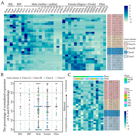 The expression pattern of GhMYCs. (A) A heatmap was constructed to demonstrate the tissue-specific expression of GhMYCs. RSL: root, stem, and leaf; BSP: bract, sepal, and petal; Anther: different anther development stages are based on bud length—for example, A3–5 represents anther in 3–5 mm bud; Ovule: ovule at different developmental stages; Fiber: Fiber at different developmental stages; DPA: days post anthesis. (B) The bias in homologous gene expression was observed to vary between tissues within GhMYCs genes in the At sub-genome. (C) A heatmap was constructed to demonstrate the expression pattern of GhMYCs between V. dahliae-resistant and -susceptible cotton cultivars after infection with V. dahliae isolates, strong pathogenicity strain V991.