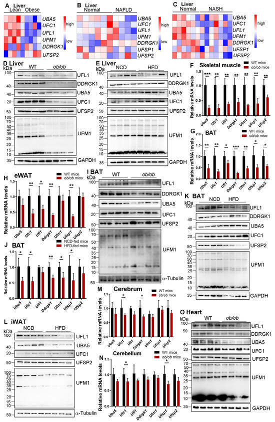 Systematic analysis of UFMylation components in the liver of patients and tissues of mice with MASLD. (A) The level of UFMylation components expression in the human liver with or without obesity in the Gene Expression Omnibus database (GSE15653). (B) The level of UFMylation components expression in the human liver with or without MASLD in the Gene Expression Omnibus database (GSE59045). (C) The level of UFMylation components expression in the human liver with or without MASH in the Gene Expression Omnibus database (GSE159676). (D) Liver samples were collected from wild-type and ob/ob mice and used to determine the expression of indicated proteins by a Western blot. n = 4. (E) Liver samples were collected from mice fed with NCD or HFD and used to determine the expression of indicated proteins by a Western blot. n = 4. Skeletal muscle (F), BAT (G), and eWAT (H) samples were collected from wild-type and ob/ob mice and used to determine the mRNA expression of indicated genes by real-time PCR. * p < 0.05; ** p < 0.01; *** p < 0.001 by Student’s t-test, n = 5. (I) BAT samples were collected from wild-type and ob/ob mice and used to determine the expression of indicated proteins by a Western blot. n = 4. (J) BAT samples were collected from mice fed with NCD or HFD and used to determine the mRNA expression of indicated genes by real-time PCR. * p < 0.05; ** p < 0.01 by Student’s t-test, n = 5. BAT (K) and iWAT (L) samples were collected from mice fed with NCD or HFD and used to determine the expression of indicated proteins by a Western blot. n = 4. Cerebrum (M) and cerebellum (N) samples were collected from wild-type and ob/ob mice and used to determine the mRNA expression of indicated genes by real-time PCR. * p < 0.05 by Student’s t-test, n = 5. (O) Heart samples were collected from wild-type and ob/ob mice and used to determine the expression of indicated proteins by a Western blot. n = 4.