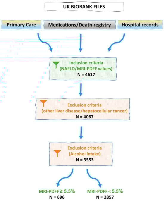 For the purpose of this study, true MASLD cases were identified by following ICD9/10 codes derived from primary care and hospital records, as also medications and death registry datasets contained in the UKBB. Patients with successful PDFF measurement assessed by abdominal MRI were included to the initial dataset and following, essential inclusion and exclusion criteria (as defined for NAFLD diagnosis at the time of analysis’ conduction, prior the new nomenclature []) were applied (Figure 1). Excluding individuals with a known alternative liver disease, drug-induced liver disease or excess alcohol intake (≥21 standard drinks/week for men and ≥14 standard drinks/week for women), the final dataset contained data from 3553 individuals. The outcome phenotype was based on the MRI-PDFF values, where individuals with PDFF lower than 5.5% were categorized as healthy controls; otherwise, they were stratified as individuals with hepatic steatosis.