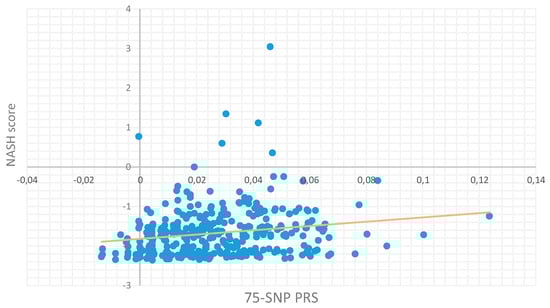 In order to identify the optimal SNP set with increased predictive power, we systematically screened the 20 SNP sets obtained from the previous phase of our study. Their predictive effectiveness in terms of the NASH score in this external population was closely evaluated (Table 4), as also in terms of the case–control association (Supplementary Table S1). The aim of this analysis was the derivation of an optimal PRS that would not contain an extended number of SNPs while still exhibit equally elevated prediction value as PRSs containing higher numbers of SNPs. Therefore, the candidate PRS consisting of 75 SNPs yielding adequately high prediction power (an incremental R2 = 0.036) while maintaining statistical significance (p-value = 0.009) was selected as the optimal one. With this regard, Figure 3 shows the fit regression model of the selected PRS predicting the NASH score in the Greek NAFLD study.