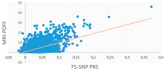 After selecting the optimal PRS according to the metrics of the models on both the validation dataset of UKBB and the external Greek cohort, we further evaluated the selected PRS to the whole set of UKBB samples. As it was mentioned before, the effect of each SNP was the mean effect of the iterations found significant by PRSice2. In Figure 4, the fit regression model of the final PRS predicting the MRI-PDFF on the entire set of UKBB samples is presented. For this model, the p-value and the incremental R2 scored 0.001 and 0.025, respectively.