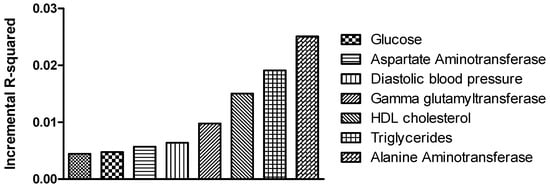 Following, we tested to which extent the optimal PRS derived from the current study could explain the variance of classic MASLD-related biomarkers, apart from the MRI-PDFF (as implemented in R statistical language). Among the characteristics that were tested for the scope of this analysis, known markers for liver injury such as alanine aminotransferase (ALT) [], aspartate aminotransferase (AST) and γ-glutamyltransferase (GGT) [], along with triglycerides [], high-density lipoprotein (HDL cholesterol) [] and blood pressure [], appeared to be associated with the SNP content of the optimal PRS. Figure 5 shows the reported variables that were significantly associated with the optimal PRS exhibiting adequate prediction power. The highest incremental R2 corresponded to the prediction of the ALT levels (incremental R2 = 0.018), meaning that the PRS could explain 1.8% of the variance for this trait. While most of the variance is explained by distinct predictors, such as sex, age and BMI, the PRS had an additional significant impact on the aforementioned traits improving the prediction model.