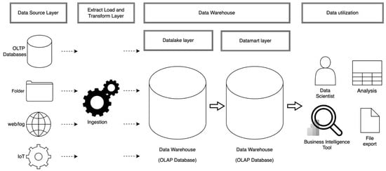 A DWH is a system designed for centralized management of large amounts of data and is commonly used by companies to integrate disparate data sources, supporting business intelligence and advanced analytics [19,20,21]. By using DWH, organizations can centrally manage processes from data ingestion, transformation, and storage to analysis, ensuring data consistency and quality while enabling efficient data management (Figure 3). The data modeled in the DWH is managed as a data mart layer, which is analyzed and visualized by data utilization layers, such as data science approaches or business intelligence (BI) tools, including graph visualization tools [22]. Additionally, cloud-hosted DWHs fully leverage the benefits of the cloud, including scalability, flexibility, cost efficiency, data sharing and collaboration, as well as security and compliance [23]. Nowadays, in addition to data management, DWHs offer enhanced capabilities for big data analytics, AI, and machine learning, allowing organizations to carry out end-to-end processes, from data management and modeling to visualization and analysis [24].