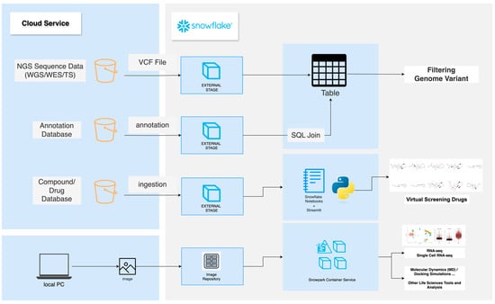 An example of a biological data management and analysis platform using Snowflake as a DWH. From top to bottom, it illustrates disease genome variant filtering analysis, in silico drug discovery analysis such as virtual screening, and transcriptome analysis, as well as other high-performance computing analyses hosted using OCI images. Cloud storage is integrated via Snowflake’s external stage feature, enabling seamless integration with external cloud storage services. The vendor logos for Snowflake are used in accordance with each company’s brand guidelines.