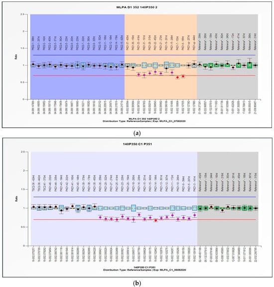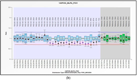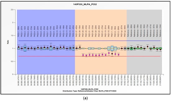Analysis with multiplex ligation probe amplification (MLPA) of PKD1 gene (light blue and orange background) (NM_001009944.3, except exons 1, 2, 4, 8, 17, 24, 28, 32, 34, 45) and of PKD2 gene (blue background) (NM_000297.4, ecept exon 13). The molecular investigation was performed on genomic DNA using Kit Salsa MLPA ProbeMix P352-D1 PKD1-PKD2 and ProbeMix P351-C1 PKD1 ©MRC Holland. The result shows a deletion of the 3–33 exons of the PKD1 gene in mosaic. The arrangement of probes based on chromosomal position reveals a heterozygous deletion (red line): probe ratio <0.5 (red dots), probe ratio 1 < x < 0.5 (purple dots). The first deleted probe was number 141 on the PKD1 gene (hg18 loc.16-002.109164) (b), while the last was number 416 on the PKD1 gene (hg18 loc.16-002.087302) (a). Black dots represent boundedprobes; exons are represented by light blue boxes (green boxes are reference exons). Results are displayed by the Coffalyser.Net software (https://www.mrcholland.com/technology/software/coffalyser-net, accessed on 22 December 2024).