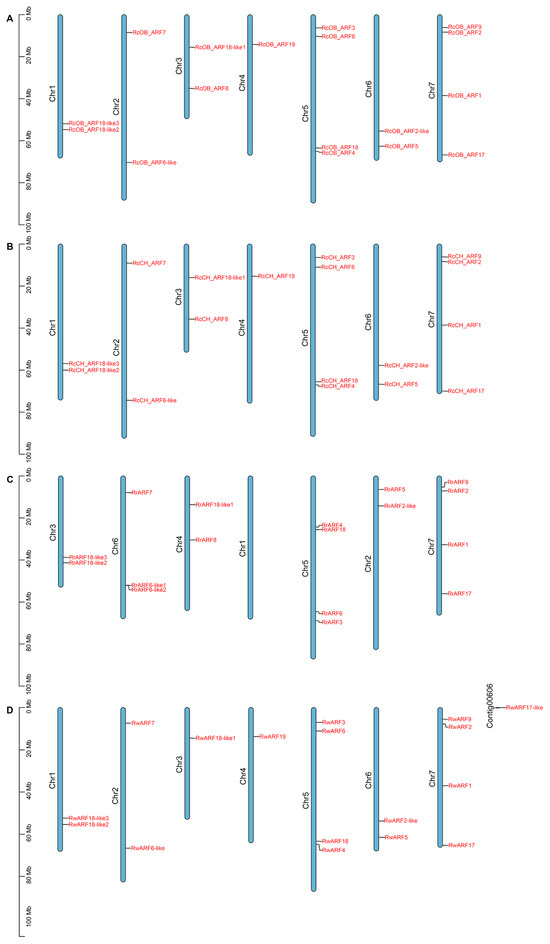 We further investigated the chromosomal locations of ARF genes in Rosa (Figure 2). The analysis showed that RcOB_ARFs and RcCH_ARFs were unevenly distributed on 7 chromosomes, RrARFs were distributed across 6 of the 7 chromosomes, and RwARFs were distributed on 7 chromosomes and a contig. The largest number of ARF genes were found on chromosome 5 (Chr5) and Chr7, each with four genes. Chr4 of ‘OB’ and ‘CH’ contained the least number of RcOB_ARFs and RcCH_ARFs, with only one gene (comprising RcOB_ARF19 and RcCH_ARF19). Chr3, Chr4, and Contig00606 of R. wichurana also contained only one gene, comprising RwARF18-like1, RwARF9, and RwARF17-like, respectively. Chr1 of R. rugosa, which was homologous with Chr4 of the other three Rosa cultivars, had no ARF genes. Moreover, Chr6 of R. rugosa had one more ARF than the homologous chromosomes of the other three Rosa cultivars, with three genes. A collinearity analysis showed that the ARF gene family of ‘OB’, ‘CH’, and R. wichurana had four pairs of segmental repeats, while R. rugosa had only three pairs of segmental repetitive genes (Figure S1).