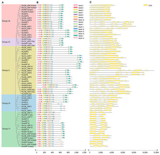 Phylogenetic tree, motifs, and gene structure of ARF genes in four Rosa cultivars. (A) Phylogenetic relationships of ARF genes from four rose cultivars. The pink-, purple-, yellow-, blue-, and green-colored blocks on the tree denote Group IA, Group IC, Group II, Group III, and Group IV, respectively. (B) Motif analyses of ARFs. The colored boxes, numbered 1–15, indicate different conserved protein motifs. (C) Gene structure of ARF genes. Exons are represented by yellow boxes; the lines between the boxes are introns.