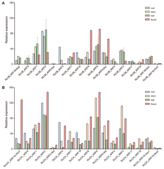 RcARF gene expression patterns in different tissues. (A) RcOB_ARFs expression in different tissues. (B) RcCH_ARFs expression in different tissues. The bars indicate one SD. Expression levels are given in FPKM.