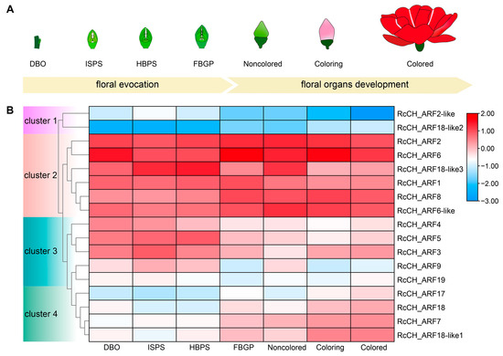 To more deeply investigate the role of ARFs in rose flower development, the expressions of RcCH_ARF genes during different stages of flower development were analyzed (Figure 5). The results showed that the expression patterns of RcCH_ARFs were classified into four clusters, which may be involved in different flower-development stages. The genes of cluster 1 had a low expression during all stages. The expression of RcCH_ARFs in cluster 2 were high throughout all flower-development stages. The expression of RcCH_ARF genes in cluster 3 and cluster 4 fluctuated during flower-development stages and showed similar expression trends, respectively. For instance, RcCH_ARF4 in cluster 3 was highly expressed during the first three stages (DBO, ISPS, and HBPS), with a lower expression in later stages (FBGP, noncolored, coloring, and colored). Furthermore, the expression level of RcCH_ARF18 in cluster 4 was low during the DBO–HBPS stages, but increased during FBGP through to the colored stage. Previous research has reported that FveARF4 (homologous to RcCH_ARF4), AtARF3 (homologous to RcCH_ARF3), and FveARF18A (homologous to RcCH_ARF18) are all involved in the regulation of flower development [18,39,45]. Thus, it could be inferred that RcCH_ARF4, RcCH_ARF3, and RcCH_ARF18 may have similar regulatory roles during the stages of flower development.