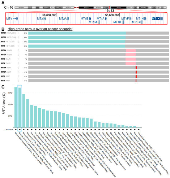 Metallothionein-protein-coding genes are all located on human chromosome region 16q13 (Figure 1A). There are 11 genes in total. No non-metallothionein protein coding genes exist between the metallothioneins within this gene cluster. High-grade serous ovarian cancer (HGSC) was queried for heterozygous loss (HETLOSS), single-allele gain (GAIN), or multiple allele amplification (AMP) of four metallothionein genes within this cluster, using cBioPortal maintained pan-cancer The Cancer Genome Atlas (TCGA) data [24,25,26]. Losses (69%) heavily outnumbered gains (7%), with nearly identical numbers for each metallothionein gene (Figure 1B). Homozygous deletions were rare (0.35%). Given their close linkage, similar event counts were expected. Zero non-synonymous single-nucleotide variant or indel mutations in these genes were found, indicating gene mutation changes rarely, if ever, drive metallothionein biology in cancer. As a representative gene, MT2A was queried across pan-cancer TCGA tumors in different tumor types (Figure 1C). HGSC was second only to the rare uterine carcinosarcoma for metallothionein gene loss percentage. Most solid cancers exhibited MT2A gene loss in over 10% of cases.