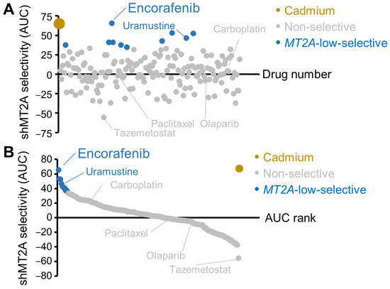 To determine what existing FDA-approved cancer drugs, many of which remain in use for solid tumor treatment, may most impact ovarian cancers with low metallothionein expression, a chemical library was obtained from the National Cancer Institute (see methods). This library was screened at three doses, i.e., 2.5 µM, 0.5 µM, and 100 nM, with each plate containing untreated control cells to enable a calculation of relative cell loss. CAOV3 cells with either shScr or shMT2A were arrayed with each cell line on the same plate in varying rows, with each drug tested with this dilution series in columns. Plates were incubated with drugs or control CdCl2 for 72 h. Plates were then fixed and stained by Hoechst 33342 and counted by fluorescence microscopy. Since the goal was to find drugs most effective at incurring cell loss in shMT2A relative to shScr, an area-under-the-curve (AUC) metric subtracting shScr loss from shMT2A loss was used across all doses tested. Results were averaged between the 2–3 assays performed for each drug and tabulated. There did not appear to be a plate order bias (Figure 6A, plotted by physical drug order), as hits were distributed throughout the chemicals tested. Ranked plotting revealed a small handful of the 179 drugs tested were more than 2 standard deviations different from the mean of all drugs tested (Figure 6B). Outliers which were selective in killing shMT2A more than shScr cells included encorafenib, an RAF inhibitor, and uramustine/uracil mustard, a DNA alkylating agent. While they did not meet the threshold criteria, other RAF inhibitors, i.e., vemurafenib, debrafenib, and sorafenib, trended for shMT2A selective cell loss, as did the downstream kinase MEK1/2 inhibitor trametinib (Supplementary Table S1). Other chemotherapies used in HGSC, including carboplatin, paclitaxel, and olaparib, were not selective for MT2A levels. An outlier uniquely non-sensitive to shMT2A cells was tazemotostat, an epigenetic regulator through EZH2 methyltransferase inhibition [31].