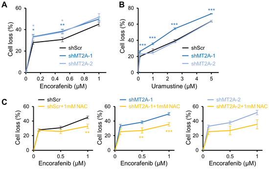 Validation assays were next performed on encorafenib and uramustine, two highly selective hits for elevated shMT2A toxicity relative to shScr. New chemicals were purchased from an independent vendor (see Methods), reconstituted in DMSO, and applied to new dose–response studies. The Hoechst 33342 nuclei counting method was used in the secondary validation. Encorafenib retained its enhanced cytotoxicity in shMT2A-1 as well as the second knockdown shMT2A-2 (Figure 7A). Uramustine, conversely, remained selective in the greater magnitude knockdown shMT2A-1, but was no longer selective in the more moderate knockdown shMT2A-2 cells (Figure 7B), perhaps due to a threshold effect of metallothionein levels. Given the robust recapitulation of shMT2A sensitivity using encorafenib, it was of interest to evaluate the mechanistic connection to metallothioneins. Metallothioneins regulate reactive oxygen species (ROS) through regulation of zinc-finger transcription factors [32], mobilization of zinc [33], and contributing to the redox cycle of glutathione [34], the primary cytoplasmic antioxidant. ROS signals through the BRAF/CRAF-MEK-MAPK pathway, often upstream of RAF through RAS activation [35]. N-acetyl cysteine (NAC) is a ROS scavenger [36], so it was tested for its ability to attenuate ROS-based signaling in the encorafenib dose response. Scavenging ROS with NAC abolished the shMT2A selectivity of encorafenib and reduced cell loss (Figure 7C).