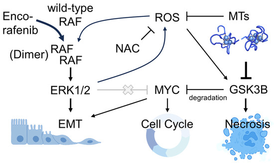The mechanism of enhanced cell loss through encorafenib treatment evidently utilizes non-canonical signaling. ERK1/2 signals directly to the commonly amplified oncoprotein MYC via phosphorylation of serine 62 [46]. In this case, reduced metallothionein levels may further activate amplified MYC through the RAF/MEK/ERK signaling pathway. RAF inhibition, through encorafenib, would be expected to reduce phospho-ERK1/2, yet we observed an increase. Others have observed this effect in wild-type BRAF cells due to an activation or priming of RAF through dimerization incurred by RAF inhibitors [47,48], which is consistent with our immunoblot and morphologic data. However, canonical RAF-ERK signaling would lead to stabilization of MYC. We observed the opposite. While further experimentation is necessary to confirm the complete molecular mechanism, destabilization of MYC was likely through ROS signaling activating GSK3β, which causes MYC degradation [37] as well as necrosis [49] (Figure 9). Bypassing this RAF signaling through both downstream effector and parallel pathway signaling may be important for clinical benefit [50]. Low-grade serous ovarian cancers are now often treated with the ERK1/2 inhibitor trametinib due to an improvement compared to previous standard of care [51]. These results may indicate low-grade ovarian cancer patients with 16q13 metallothionein cluster loss may further benefit from trametinib treatments. Pre-clinical studies with controlled metallothionein expression levels in specific cancer types are needed to address such possibilities.