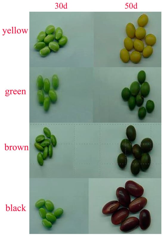 In this study, the soybean strain Beinong 108 was used as the female parent, and the green bean was used as the male parent. F1 was obtained after crossbreeding. The F1 generation from the cross was then continuously selfed for 4 years to obtain an F2:5 segregating population of 1139 lines. The seed coat colors of the parents Beinong 108 and lima bean are green, and the offspring have three seed coat colors: green, black, and brown (Figure S1). The test lines were planted in the eastern area of Beijing Agricultural College on 10 June 2019. The green seed coat, black seed coat, and brown seed coat were separated from the yellow seed coat (Zhonghuang 14) and (Beinong 108 × green bean) F2:5. The soybean seed coats 30 days after seeding (when the color of the seed coat had not changed) and 50 days after seeding (when the color of the seed coat had completely changed) were quickly frozen in liquid nitrogen in 1.5 µL centrifuge tubes and stored in an ultralow-temperature refrigerator at −80 °C (Figure 1).