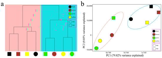 (a) Cluster dendrogram showing the two different developmental stages of the dynamics of changes in the color of the soybean seed coat. (b) PCA of eight RNA-seq samples.