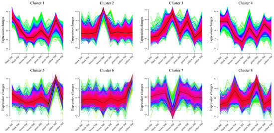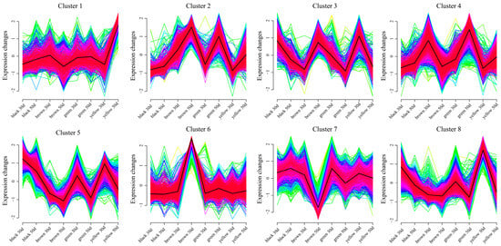 Using the k-means clustering method, a total of eight statistically significant clusters were identified from 11,792 DEGs in the lines (Figure 5). Cluster 1 presented the highest expression level in the yellow line at 50 days, and its expression level in the other lines remained unchanged. The expression level of Cluster 2 increased with development in the four lines, and the expression level was the highest at 50 days in the brown and green lines. In Cluster 3, except for the increase in expression in brown, the expression in the other three lines decreased. The change trend of Cluster 4 is opposite to that of Cluster 3. The expression in brown decreased, whereas the expression in the other three lines increased. The expression level of Cluster 5 decreased in all the lines, and the expression level was highest in the black line at 30 days. The expression level of Cluster 6 in the brown line increased, and the expression level was the highest at 50 days. The expression levels in the other lines did not change. The expression level of Cluster 7 in the brown line decreased, and the expression level was the lowest at 50 days. The expression levels in the other lines did not change. The expression level of Cluster 8 decreased in all the lines, and the expression level of the yellow line was the highest at 30 days.